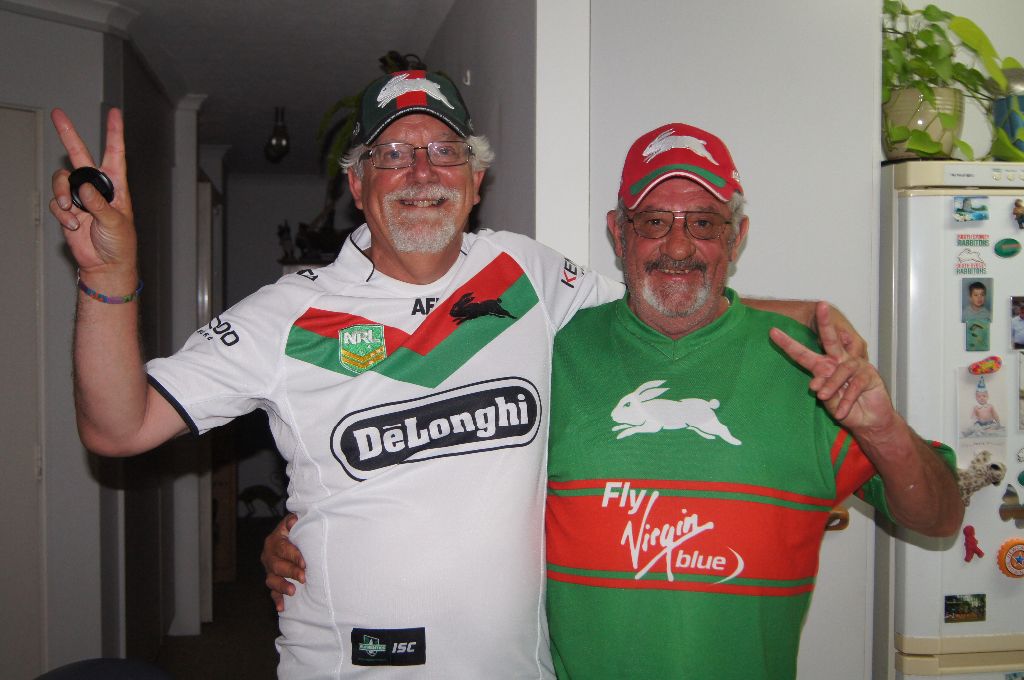 The old man loves his sister, now a long term Mangolander, sharing her years with a brother-in-law he respects immensely. He was looking forward to settling in with their company for the final days of his sojourn. He was not let down – they treated him royally, with him renewing his envy of the cruisiness of their existence in these northern climes. His sister’s hubby is a Vietnam vet, that being in part reason for the old man holding the ex-navy man in such esteem. As his own father had done, his brother-in-law had been prepared to put his life on the line for his country in a time of war. He was told that he was now known as ‘Seaweed’ around the traps, but the honoured guest preferred to stay true to the birth-name. Glen has always had a salty turn of phrase and that was well in evidence during the visit. When his scatter-gun approach to humour hit the mark, as it did on more that one occasion, the old man laughed and laughed. Both he and brother-in-law are addicted to newsprint, a coquettish shiraz or two and each a game involving an oval leather ball. The Hawthorn supporter of yore learnt to be a Rabbitoh all over again (see image of the old fellow attired in the accoutrements of said Bunnies) whilst they sipped on their respective nightcaps. Glen prefers the juice of the cane whilst the temporary resident of their home across from one of Maroochydore’s best beaches adores juice extracted from a Scottish peat bog. Sadly South Sydney could not replicate the mighty Hawks by making it into a grand final, despite the best urgings from the comfort of the La-Z-Boys.