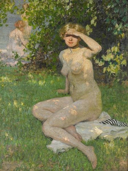 A stunningly beautiful auburn haired, green eyed beauty, Anderson was first a pupil of Fox’s – it’s interesting to note that, although men still dominated the world of art back then, women far outnumbered them as pupils. She and Fox later became great mates, it being the artist who introduced her to her future husband, fellow dauber Penleigh Boyd. The surname is a famous one in Australian artistic circles. They later produced a son, Robin, who dominated the architectural landscape of the country in later life, writing the seminal ‘The Great Australian Ugliness’. Arthur Boyd was a nephew. As an artist Penleigh was mainly a landscapist, but it is conceivable that in that millieu Ethel – maybe even both Ethels – would be liberated enough to divest themselves of clothing in the name of art. As to Ethel Boyd, comparing the pictures – there would seem a certain similarity to the model who posed as the voluptuous sun dappled beauty, shading her eyes in the French soleil, with the one in the aforementioned trio of works. It seemed the same model featured in other of Fox’s nudes – some quite intimate. The hair’s the giveaway – although in the days pre-August, 1914 women of that hued hair were favoured as models – so I could be completely askew in my thinking.