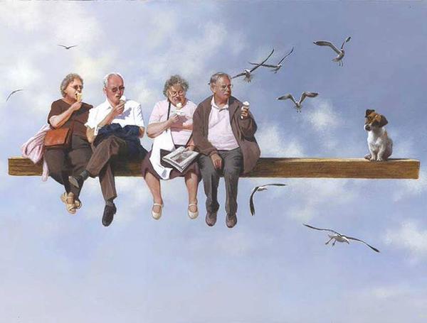 A rabbit perched on the shell of a giant snail; a group of Brit excursioners – they could only be Poms given their attire – floating through the air on a wooden plank, counter-balanced by a cute doggie; oarsmen rowing their way through a sea of denim or, this scribe’s pick, a super, super cuddly ted with boy and dog. It’s all the dreams of childhood before reality quells.